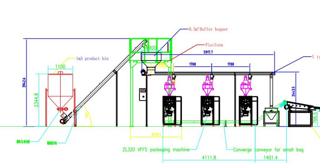 1, Küçük çanta şekillendirme dolum paketleme makinesi. Hammadde hunisi, Eğimli vidalı besleme makinesi dahil olmak üzere bu kısım. Orta tampon hunisi ve tüm hammaddeleri 6 set Auger ölçüm makinesine göndermek için yatay besleme vidası