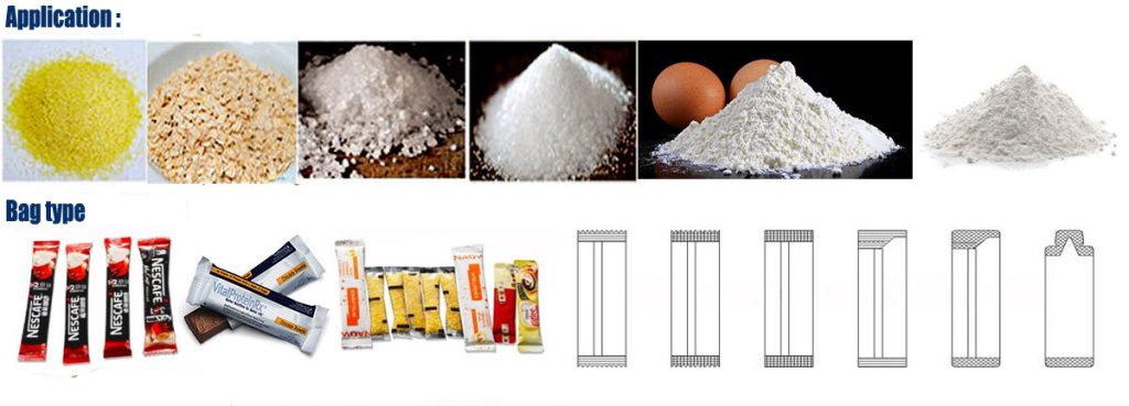 Bu makine ağırlıklı olarak süt tozu, süt tozu, kahve tozu, baharat, köri tozu, protein tozu, çeşni, bitkisel toz, kimyasal ve tıbbi toz ürünleri gibi toz ürünlerini paketlemek için kullanılır.